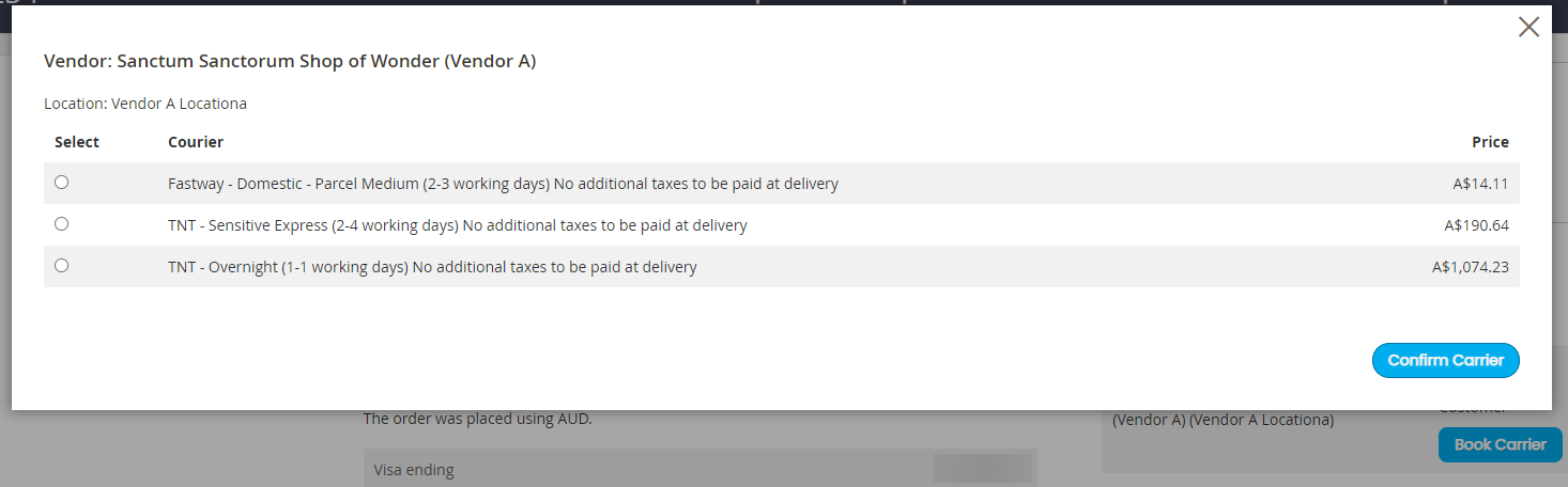 NOTE: Depending on your configuration to use Live Rates or not, it will determine if the customer had already selected the courier, or if you will select the courier.