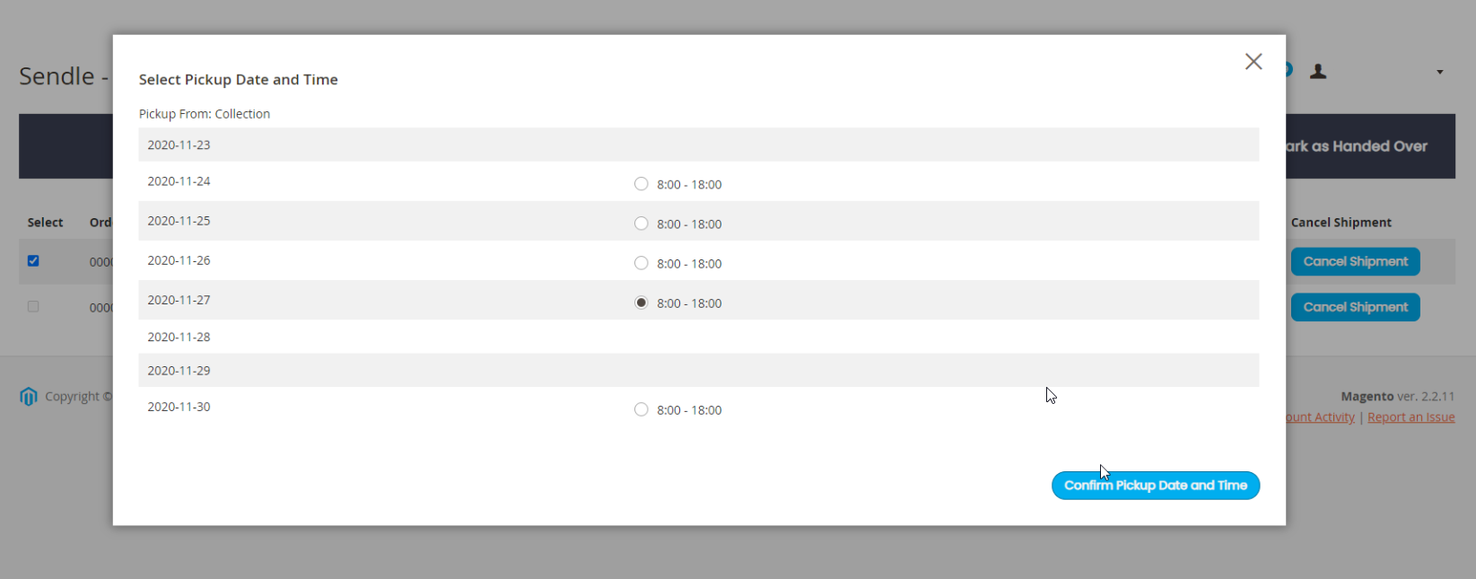 - A pop window will appear with the available days and times (depending on couriers) that the orders can be picked up. Simply select a timeslot and choose Confirm Pickup Date and Time.