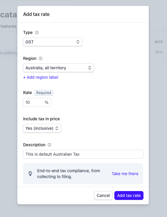 A pop up will appear where you can populate tax details (See Australia tax rate example below).