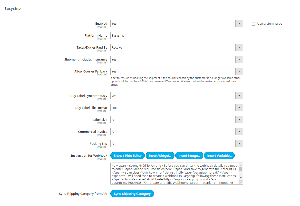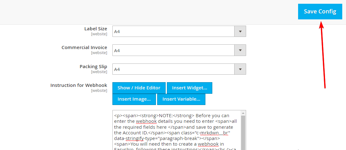 <p><span><strong>NOTE:</strong> Before you can enter the webhook details you need to enter <span>all the required fields here </span>and save to generate the Account ID.</span><span class="c-mrkdwn__br" data-stringify-type="paragraph-break"></span><span>You will need then to create a webhook in Easyship, following these instructions:</span><br /><a class="c-link" href="https://support.easyship.com/hc/en-us/articles/360039354771-Create-and-Edit-Webhooks" target="_blank" rel="noopener noreferrer" data-stringify-link="https://support.easyship.com/hc/en-us/articles/360039354771-Create-and-Edit-Webhooks" data-sk="tooltip_parent">https://support.easyship.com/hc/en-us/articles/360039354771-Create-and-Edit-Webhooks</a></p> <p>The<span> endpoint you save in your Easyship account will be </span><strong>https://demo.omnyfy.com/easyship/webhook/shipment/account/{account_id},</strong><span> replacing {account_id} with the number generated in the Account ID field</span>.</p> <p>EG: <strong>https://demo.omnyfy.com/easyship/webhook/shipment/account/1</strong></p> <p><span class="c-mrkdwn__br" data-stringify-type="paragraph-break"></span>When creating your webhook, please also ensure you have checked the following boxes:</p> <ul> <li>shipment.canceled</li> <li>shipment.label.created</li> <li>shipment.label.failed</li> <li>shipment.tracking.status.changed</li> </ul>Replace the 2 references of https://demo.omnyfy.com in this text with your own domain.