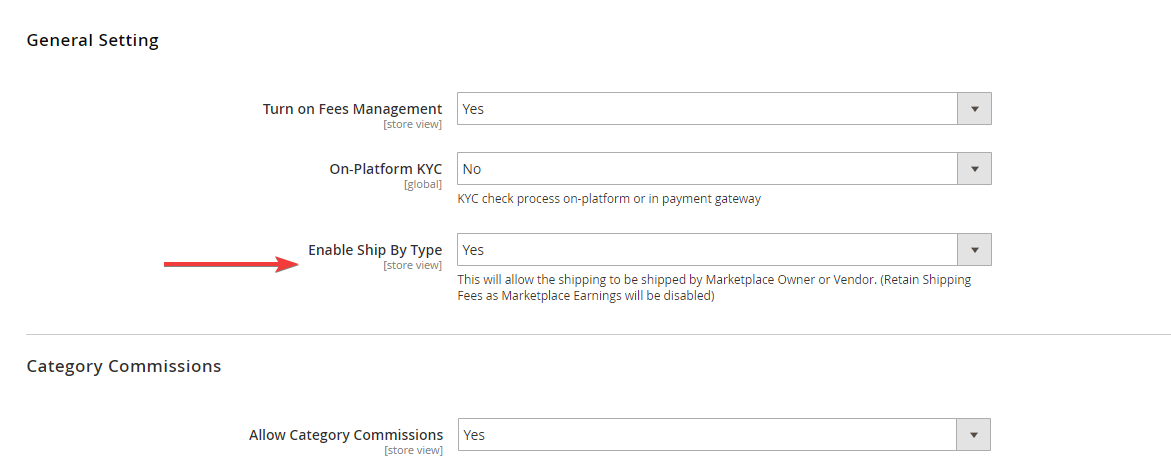 Navigate to Stores > Configuration > Omnyfy > Marketplace Commercial Management > Enable Ship By Type > Yes