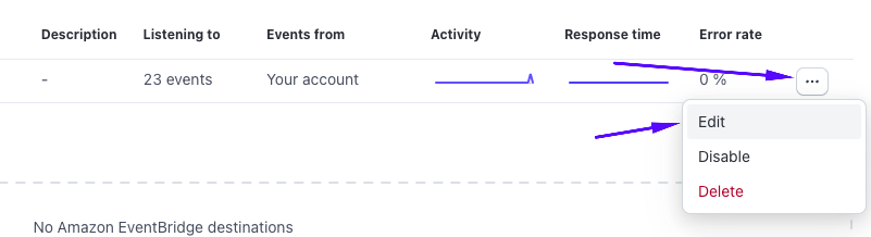 First, you will need to modify the existing webhook created from the configuration with the end URL "/stripe/webhooks". From the right, you will be able to hover on the row and see the 3 dots. Click on this and can select Edit from the dropdown.