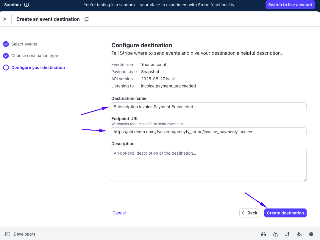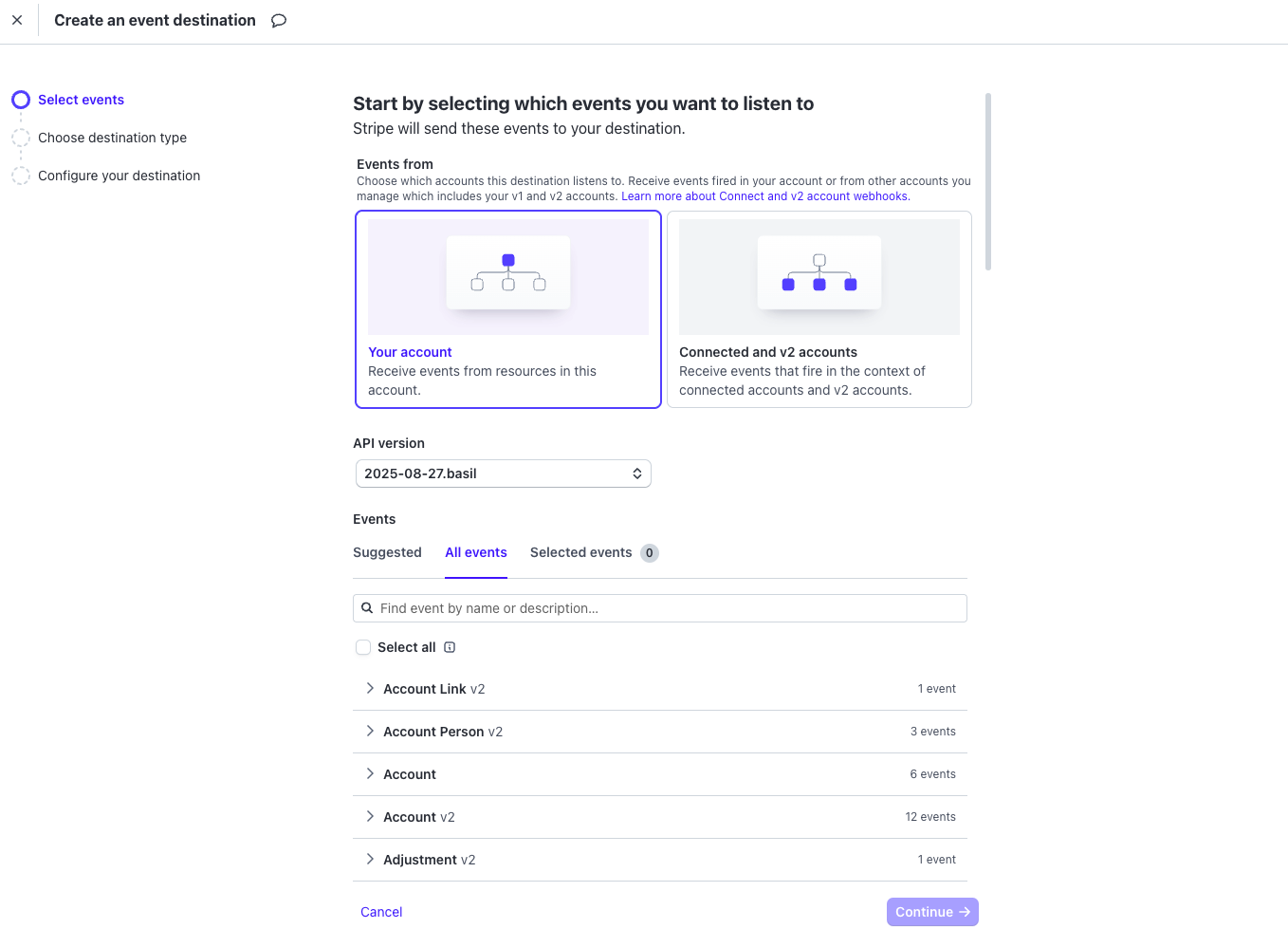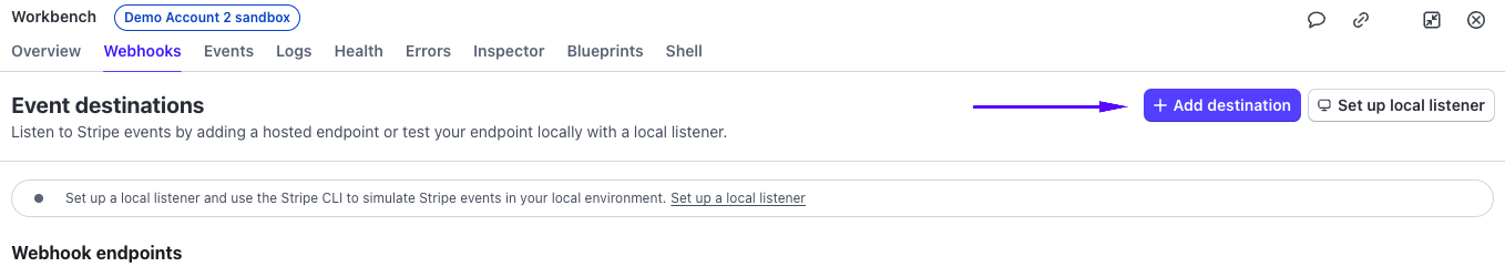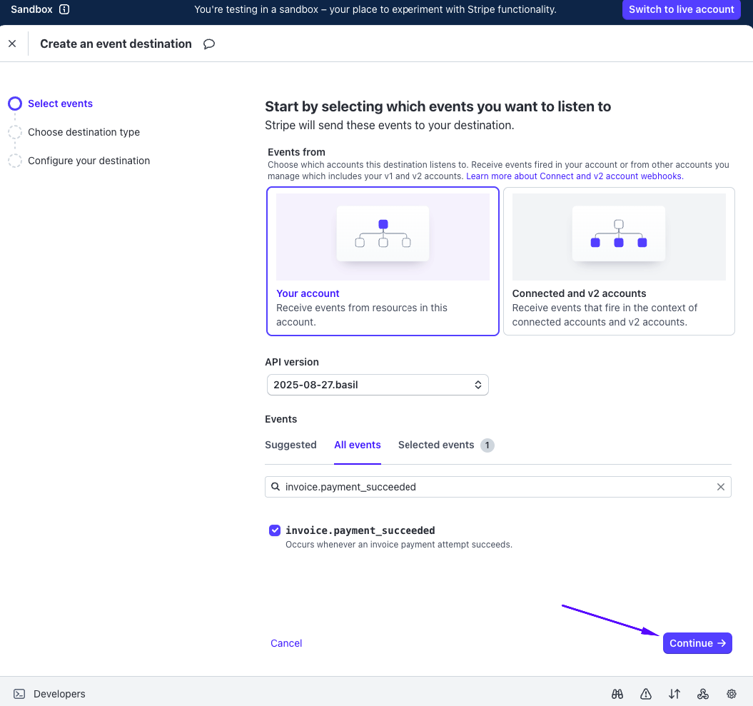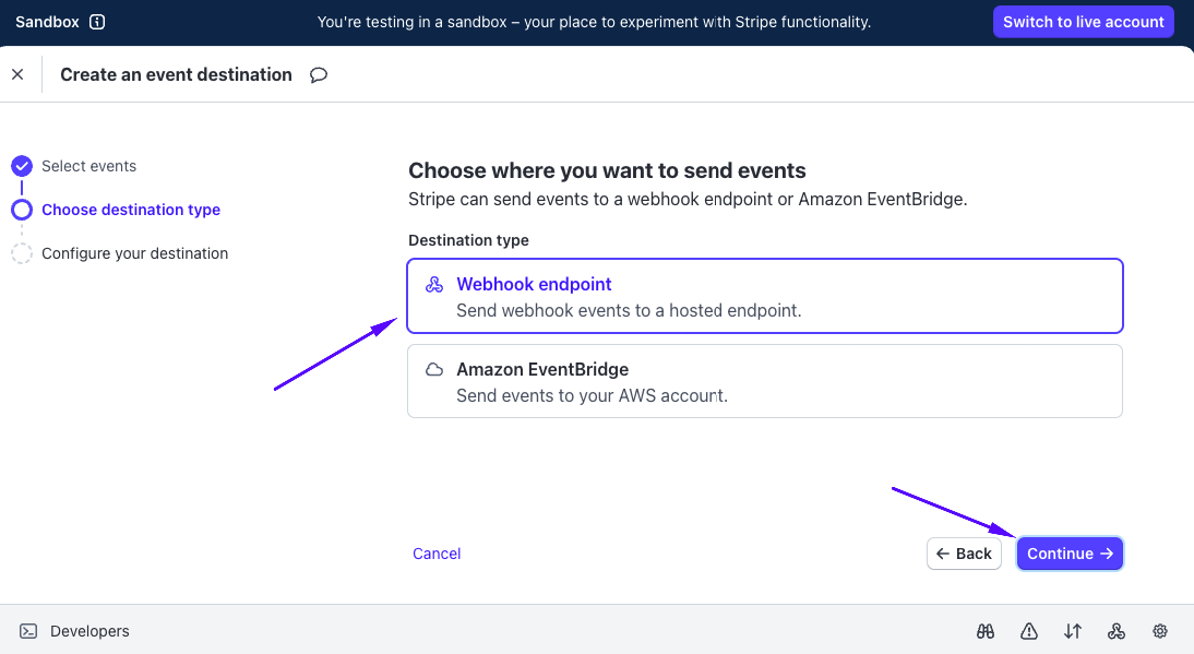 On the next step, ensure the Destination type is Webhook endpoint. Then select Continue on the bottom right.