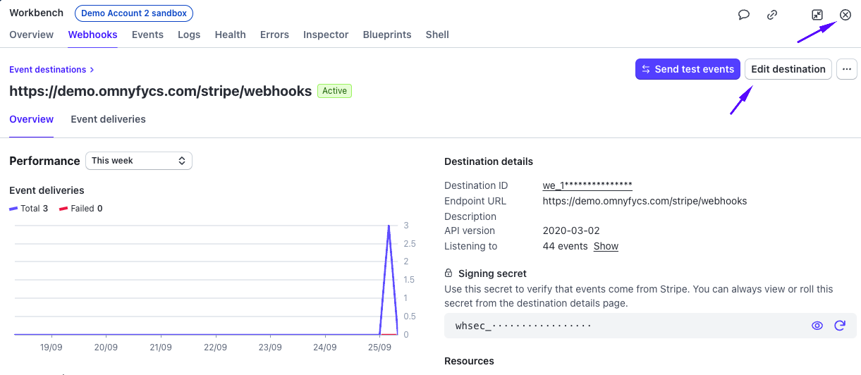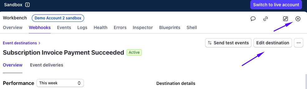 A pop up will appear and you can either select Edit destination to modify this webhook, or the X at the top right to close this.