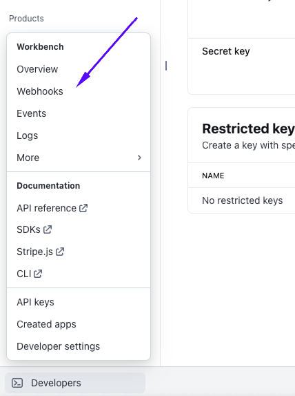 From Stripe, select Developers from the bottom left, once a dropdown appears, select Workbench > Webhooks.