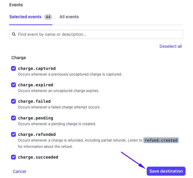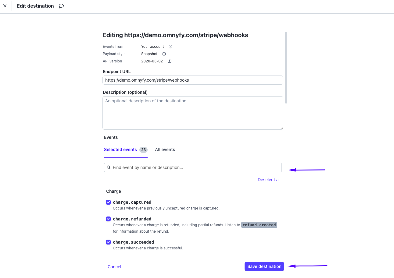 Here, you can see the Endpoint URL, Descriptions and Events. By default, the selected events will have 23 items. You will also see the Save destination at the bottom to save your changes at any time (to be used later).