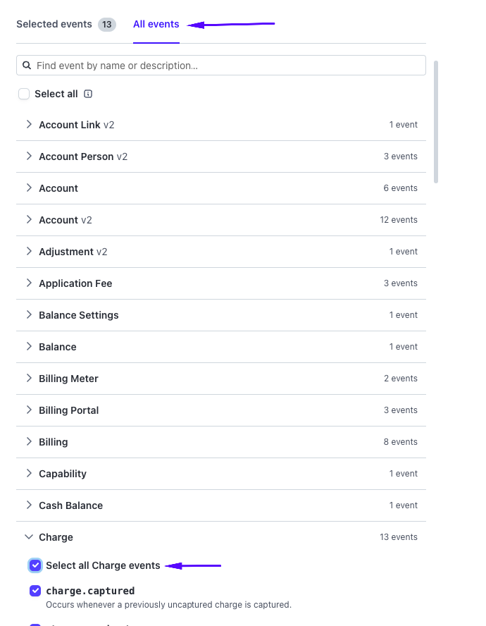 NOTE: Typing in the events from the dropdown will not show the "Select all X events", so scrolling down will be the easiest method.