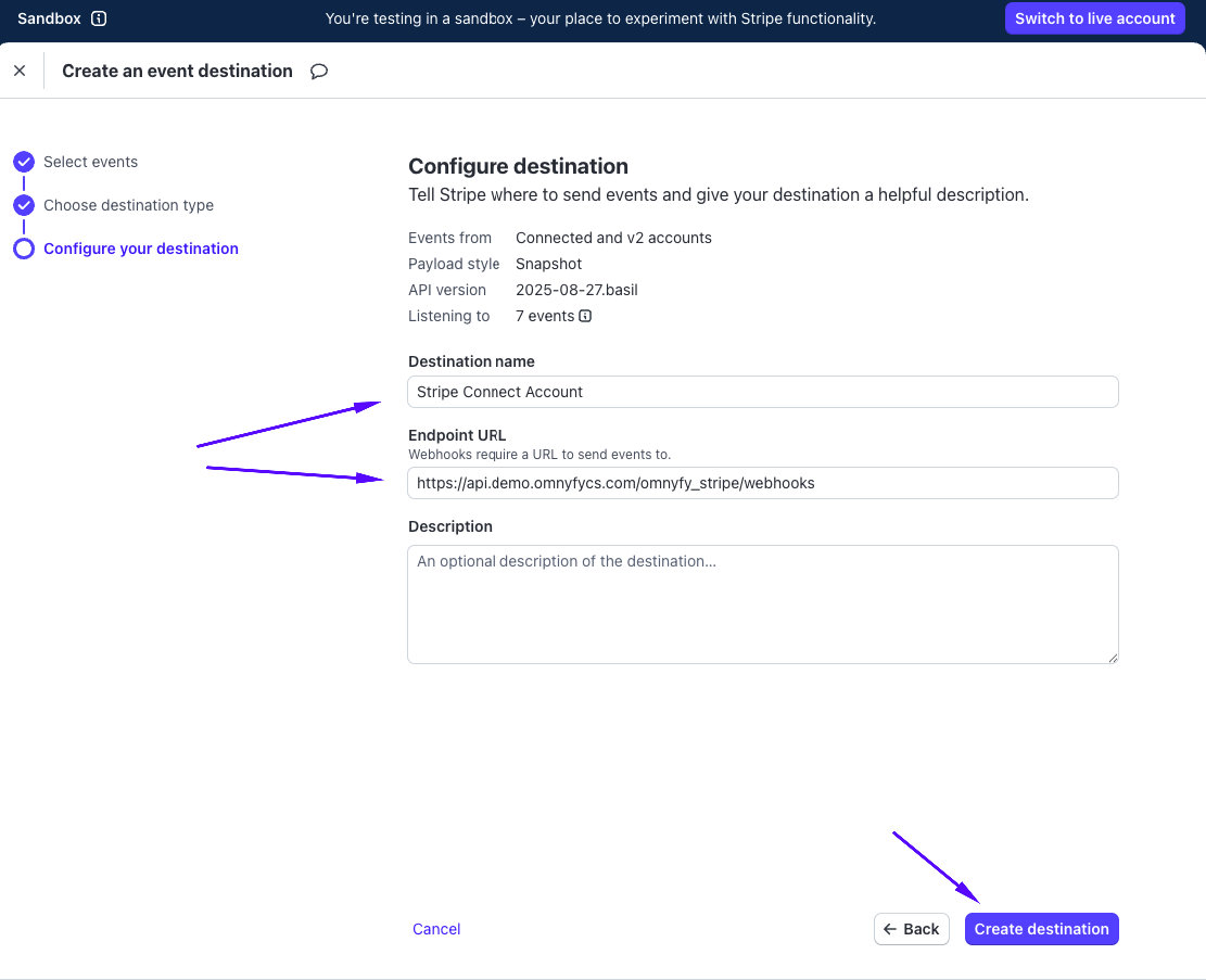 - Endpoint URL: Please use the same URL prefix format as per Glyde / Non-Glyde webooks as the payment method. Then add "/omnyfy_stripe/webhooks" at the end of the URL - such as https://api.demo.omnyfycs.com/omnyfy_stripe/webhooks for a Glyde URL.