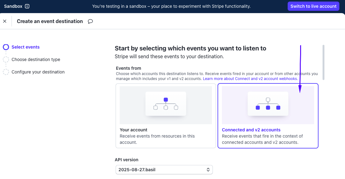 When you select Add Destination, choose from Events from > Connected and v2 accounts.