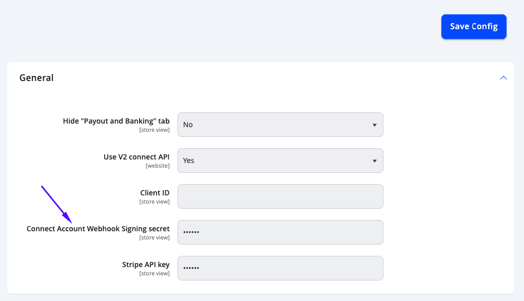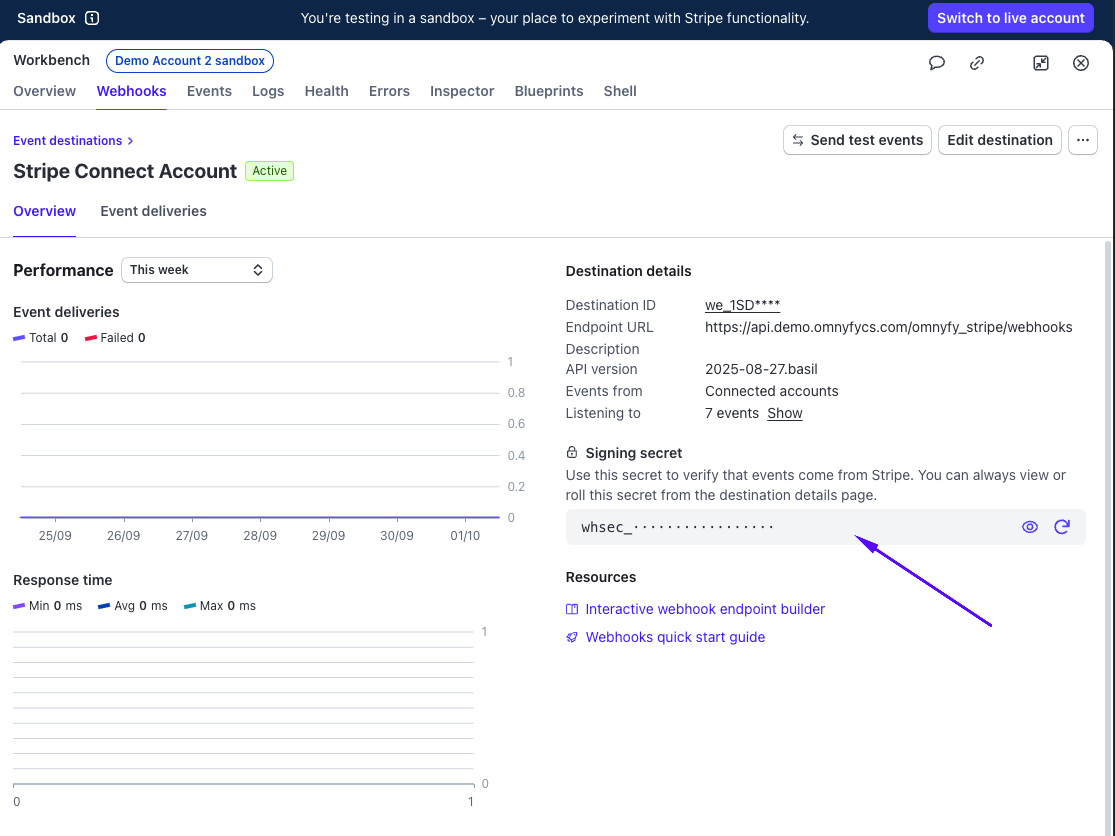 Paste the Signing Secret in the Connect Account Webhook Signing secret field here.