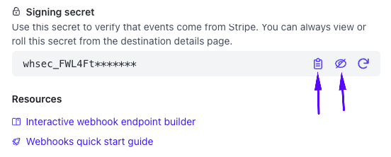 Select the Eye icon to reveal the Signing secret. Once revealed, you can also select the clipboard icon to copy the Secret Key. This will be used in the Stripe configuration.