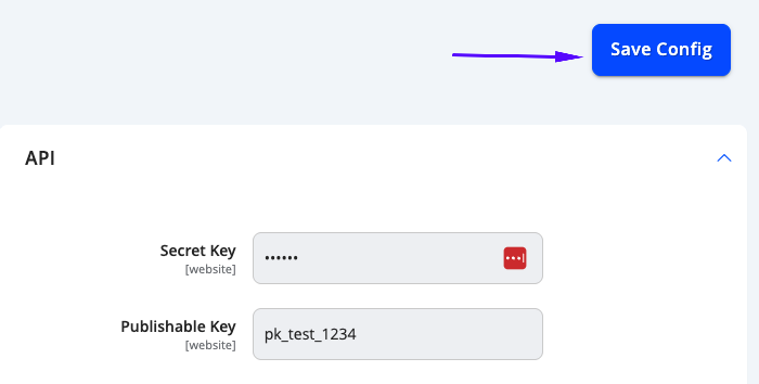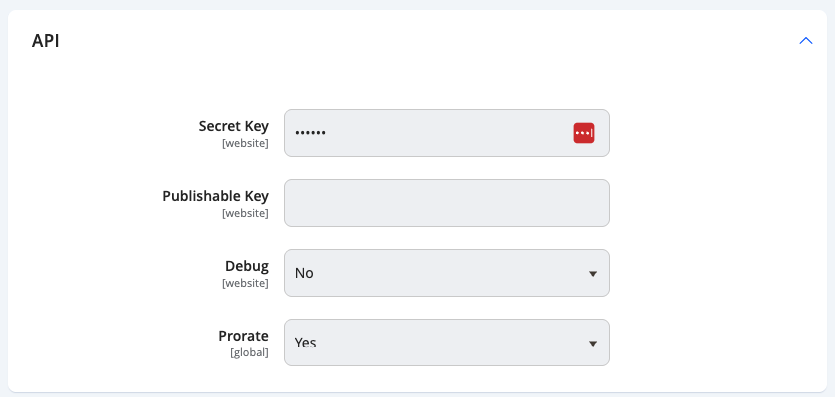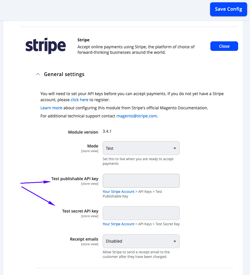 From the General settings dropdown section, there will be 2 fields to paste your API Keys. Depending if you are configuring Test (which will encompass Sandbox and Test Mode) or Live mode (which will encompass real transactions), you can paste the relevant keys for the different modes.