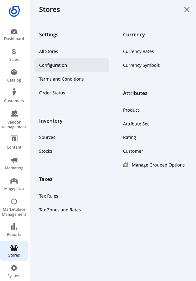 To configure the Marketplace with your Stripe account tokens, as an administrator, log in to the Admin Portal and navigate to Stores > Settings > Configuration.