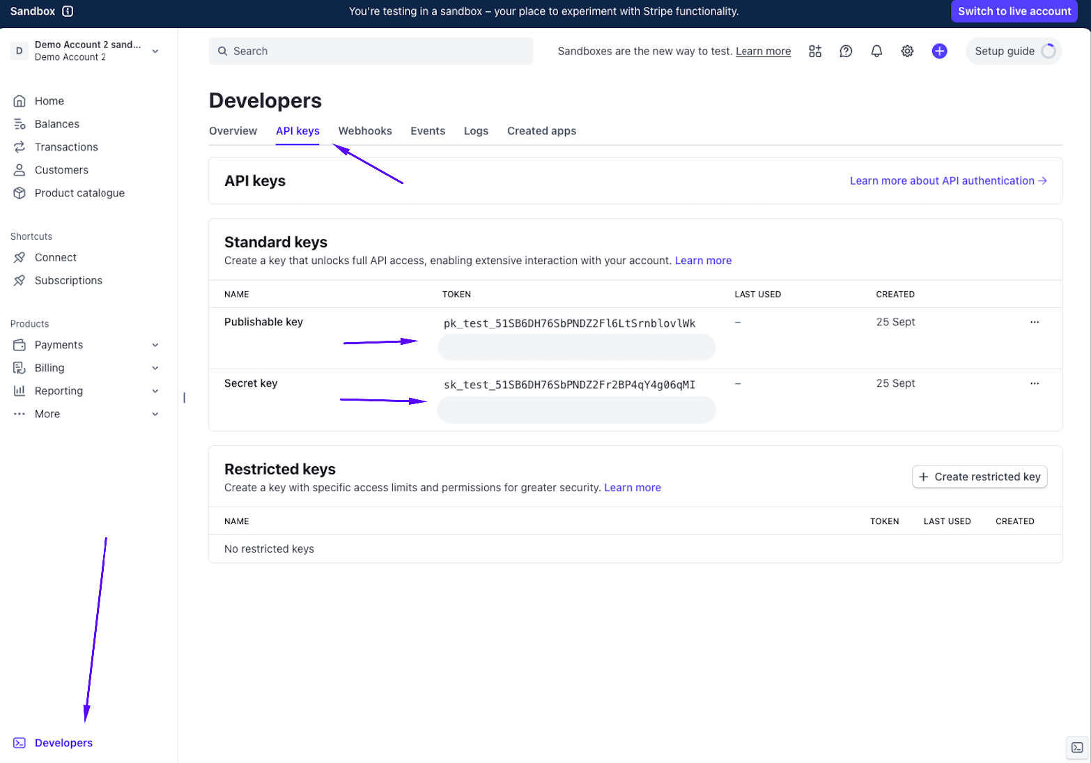 In your Stripe account, navigate from the bottom left with Developers and select the API Keys tab.