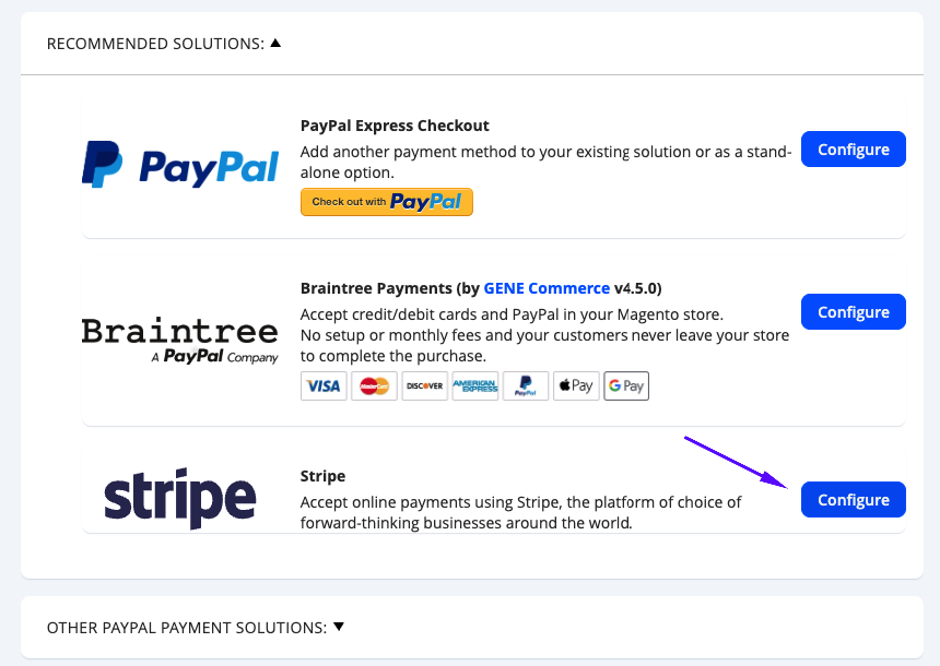 Scroll down to the Recommended Solutions > Stripe > Configure.
