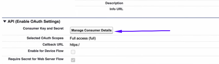 From the app details page, navigate down to the API (Enable OAuth Settings) section and select Manage Consumer Details.