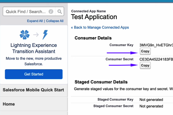 Some of these fields, they can be found from the Salesforce Admin Portal or App Manager. This integration requires a Connected App enabled with the correct roles and configuration.