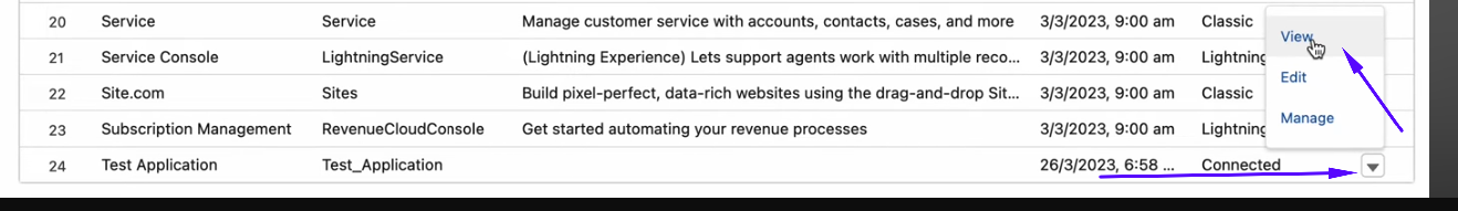 You can either create or edit an existing connected app. If you have an existing app, navigate to the dropdown from this grid and select View.