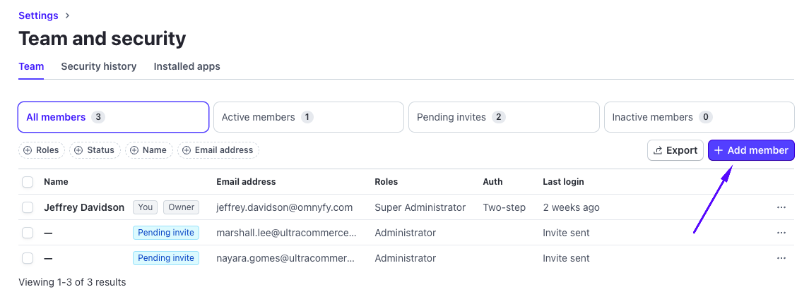 From here, you can see all members who have access or have been invited to your Stripe account. Select + Add member from the top right of the page.