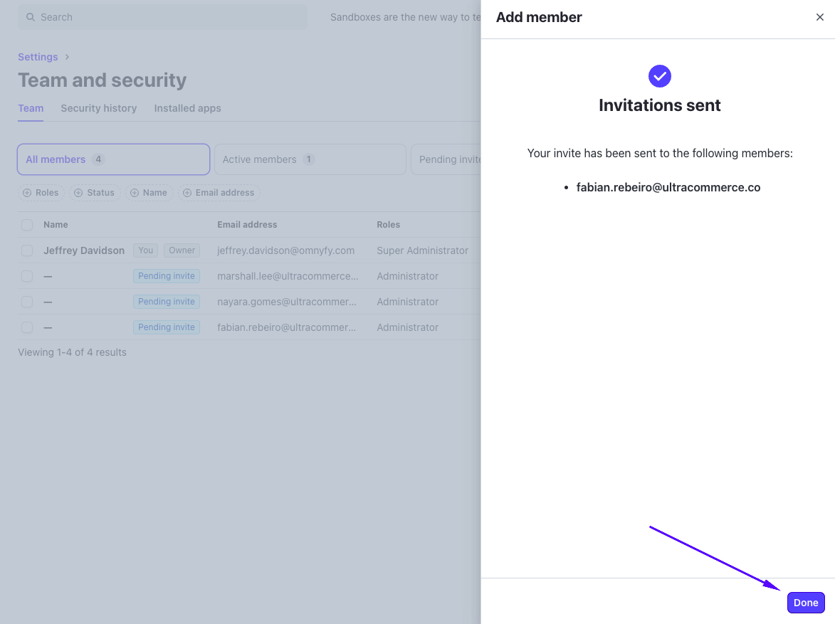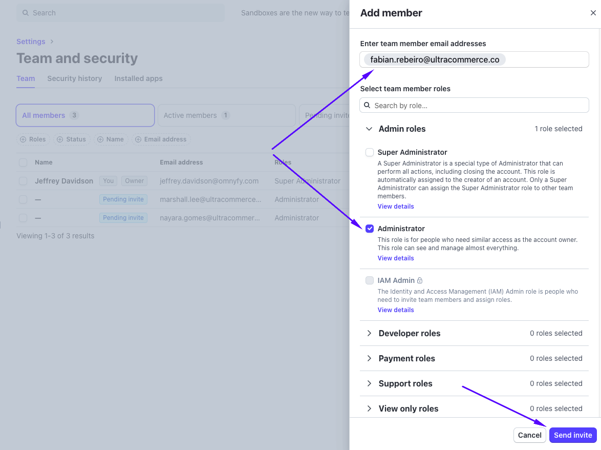 Your invitation will then be sent to the specific team member with the role. The User will need to accept it before obtaining access to the account. You can also see their status in the Teams and security page (it will appear as Pending invite if they have yet to action this).