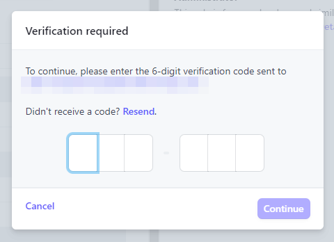 Once you receive the 6 digit code to the necessary email address, input it into the 6 digit boxes and select Continue.