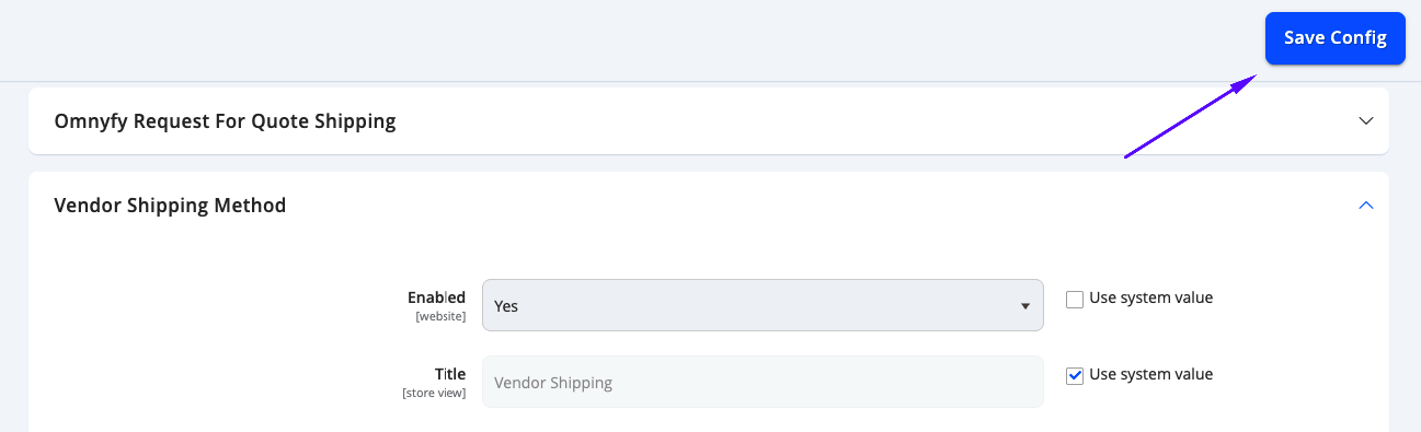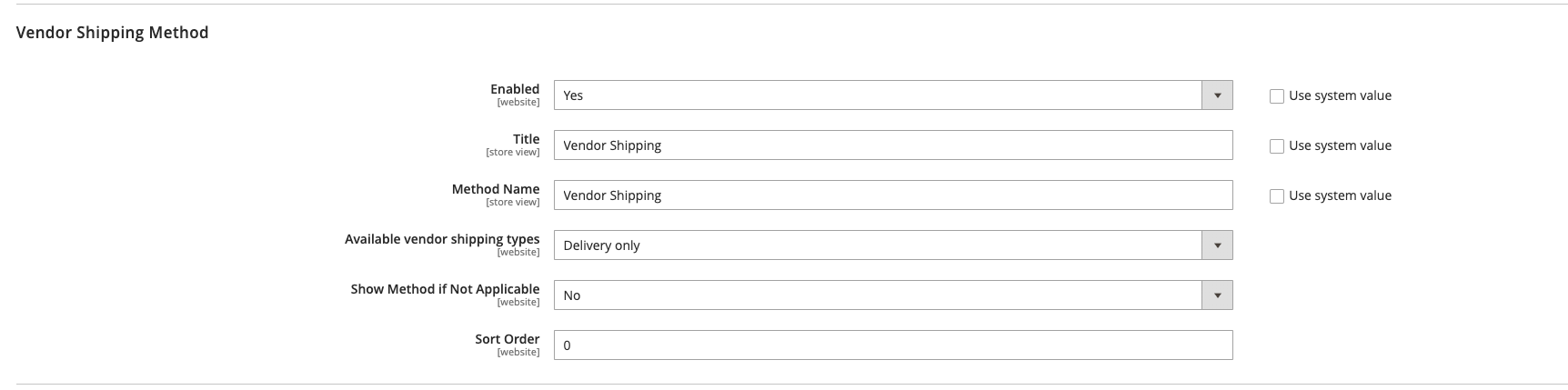 This module requires an initial configuration by the Marketplace Owner. The first step of the configuration is located at Stores > Configuration > Sales > Delivery Methods > Vendor Shipping Method.