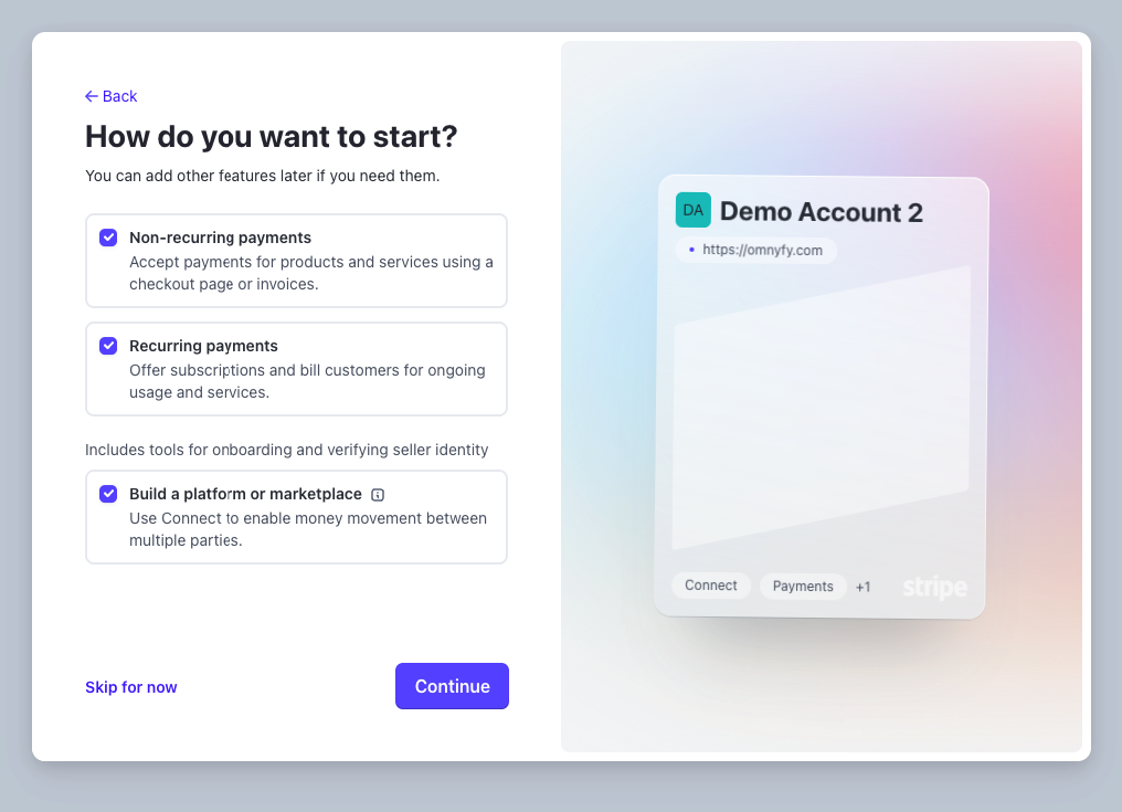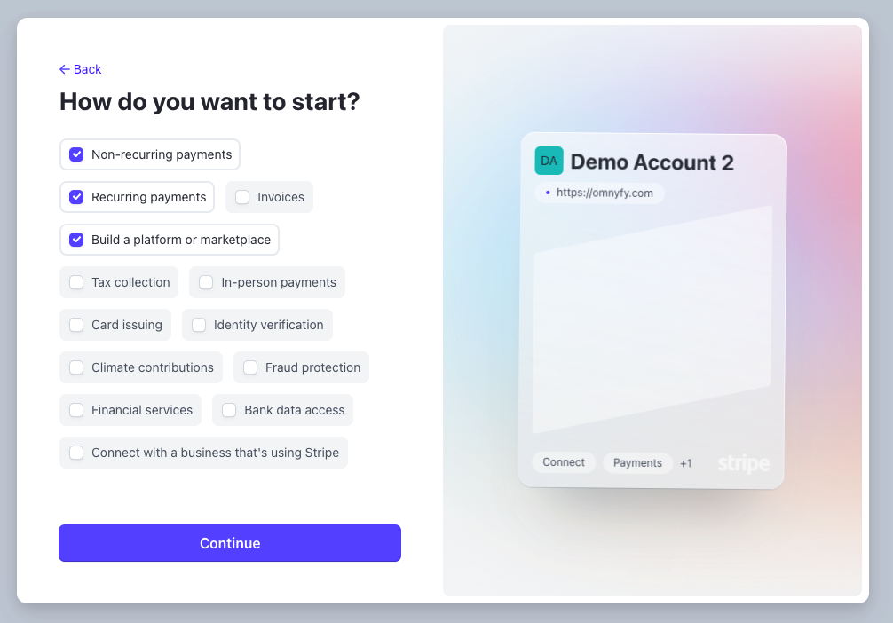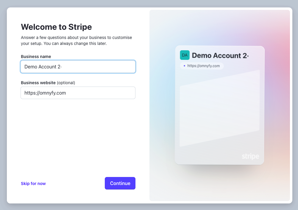 You can input your business name and website (you can use dummy information for use with staging environments only). Select Continue.