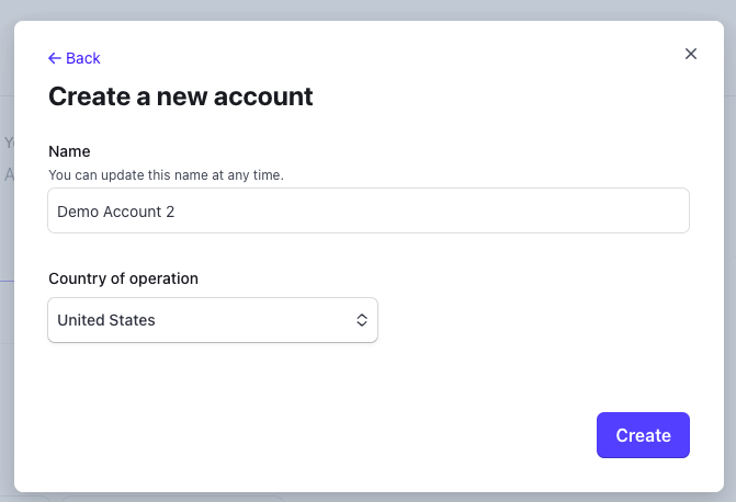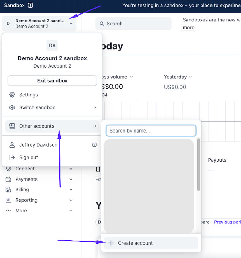 If you already have a Stripe login account and wish to create a new Stripe account for the marketplace, you can do so from the top left dropdown by selecting Other accounts > Create Account.